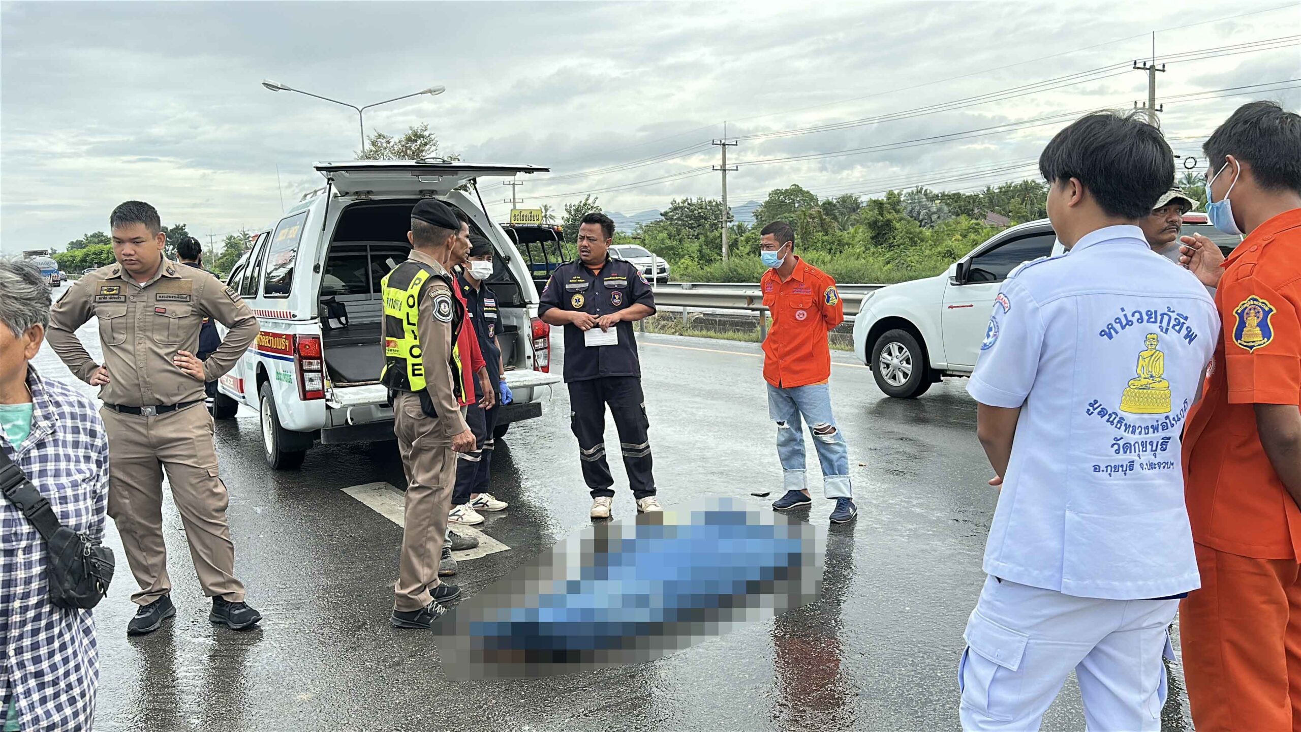 ขี่มอเตอร์ไซค์ข้ามถนน เพิ่งเห็นกระบะมาทางตรง ต่างคนต่างเบรก รถล้มกระบะหมุนฟาดกระเด็นดับคาที่