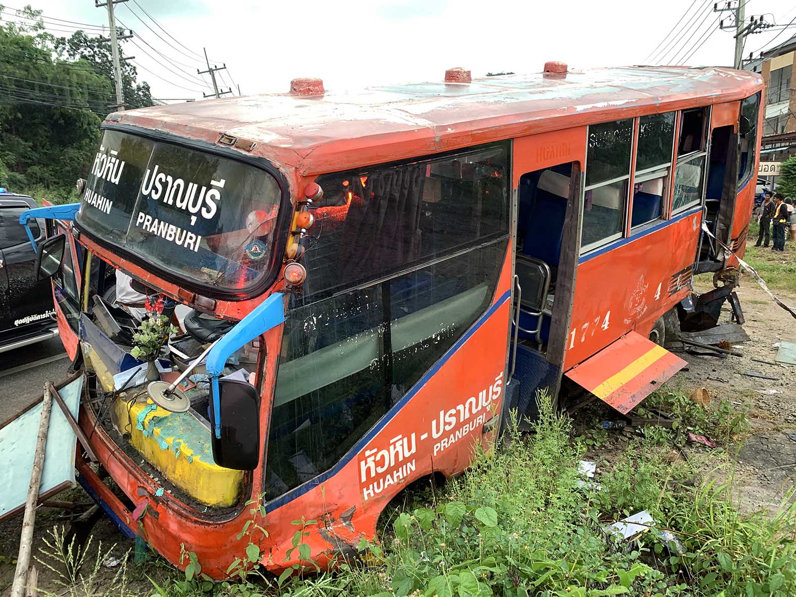 เมื่อเวลา 16.30 น. ของวันที่ 30 ตุลาคม 2568 ศูนย์วิทยุรับแจ้งเหตุ 191 สภ.หัวหิน จ.ประจวบฯ รับแจ้งเกิดอุบัติเหตุรถบัสโดยสารชนเสาไฟฟ้าข้างทาง บริเวณถนนสายหัวหิน – หนองพลับ เขตเทศบาลนครหัวหิน มีผู้บาดเจ็บหลายราย จึงประสานรถกู้ภัยมูลนิธิสว่างหัวหินธรรมสถานรุดไปยังที่เหตุ บริเวณทางลงช่องเขาด่าน ก่อนถึงร้านตี๋เฮงติ่มซำ ประมาณ 50 เมตร พบรถบัสโดยสาร 6 ล้อ สภาพเก่า สีส้ม หมายเลขข้างรถ 1774 – 4 หมายเลขทะเบียน 10 – 0400 ประจวบฯ วิ่งระหว่างหัวหิน – ปราณบุรี จอดอยู่ริมถนน ในสภาพเพลารถขาด ล้อหน้าหลุด ชิ้นส่วนกระจัดกระจาย ซีกซ้ายเสียหายพังทั้งแถบ ภาพในรถพบผู้โดยสารส่วนใหญ่เป็นนักศึกษาวิชาทหาร (รด.) ชาย/หญิง โรงเรียนหัวหินวิทยาคม จำนวนนับสิบคน ส่งเสียงร้องเจ็บปวดขอความช่วยเหลือกันระงม จึงช่วยกันนำร่างออกจากตัวรถ พบผู้บาดเจ็บมีแผลถลอกตามร่างกายจำนวน 8 ราย นำส่ง รพ.หัวหิน ให้แพทย์รักษา