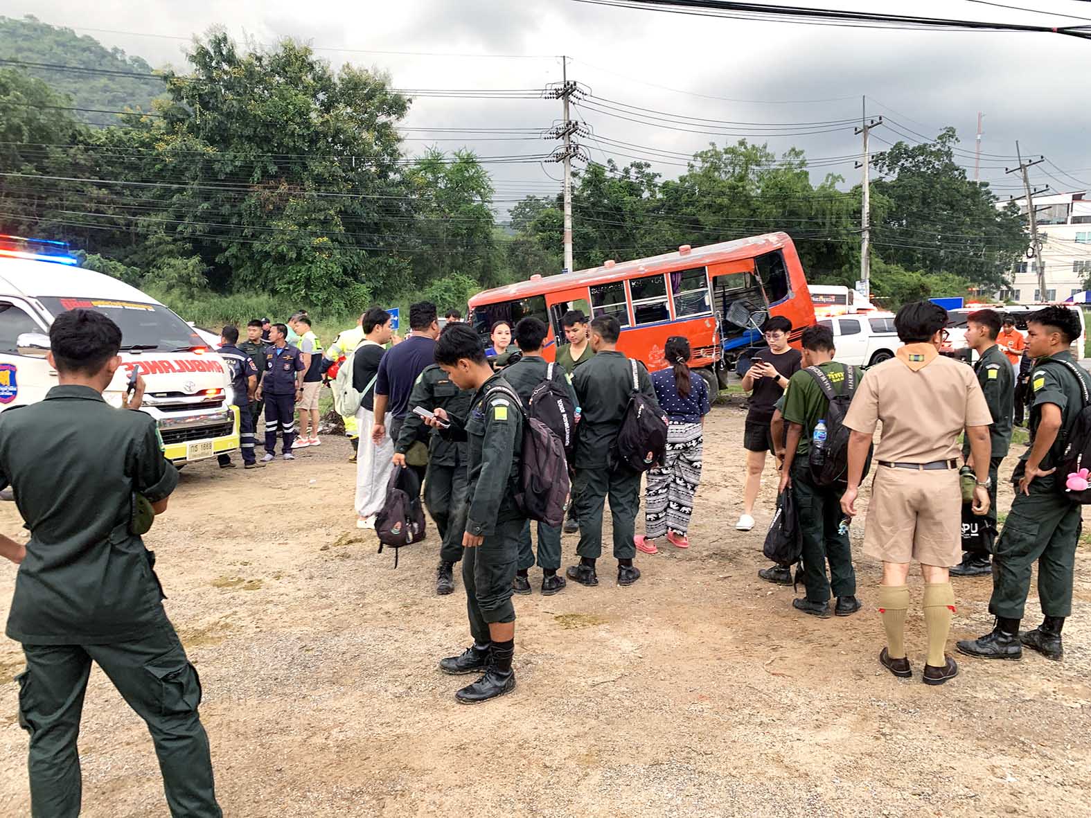 รถบัสบรรทุกนักศึกษา รด.มาเต็มคัน เกิดเสียหลักชนเสาไฟข้างทาง บาดเจ็บระนาว