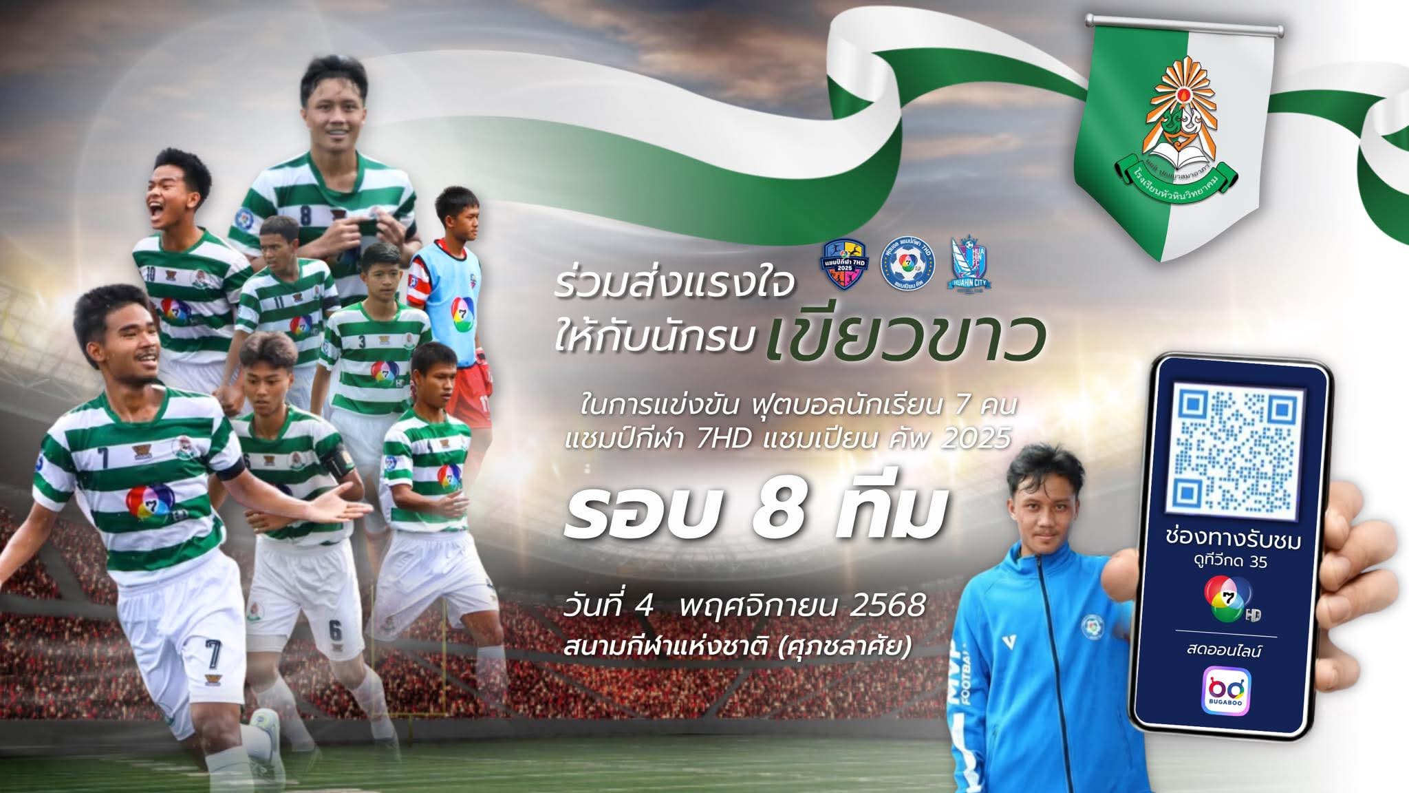 “ขอเชิญชวนทุกคนร่วมส่งแรงเชียร์ แรงใจให้กับนักรบเขียวขาวในการแข่งขันฟุตบอลนักเรียน 7 คน แชมป์กีฬา 7HD แชมเปียนคัพ 2025 รอบ 8 ทีม ณ สนามศุภชลาศัย ซึ่งโปรแกรมการแข่งขันรอบรอบ 8 ทีม โรงเรียนหัวหินวิทยาคม จะพบกับโรงเรียนสวนป่าเขาชะอางค์ ในวันที่ 4 พฤศจิกายนนี้ เวลา 11.00 น.” นายอติชาติ กล่าวในตอนท้าย.