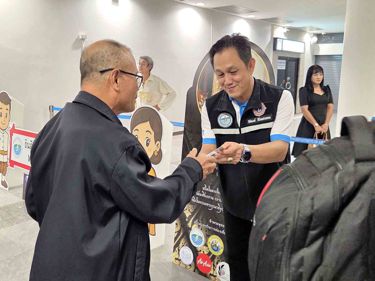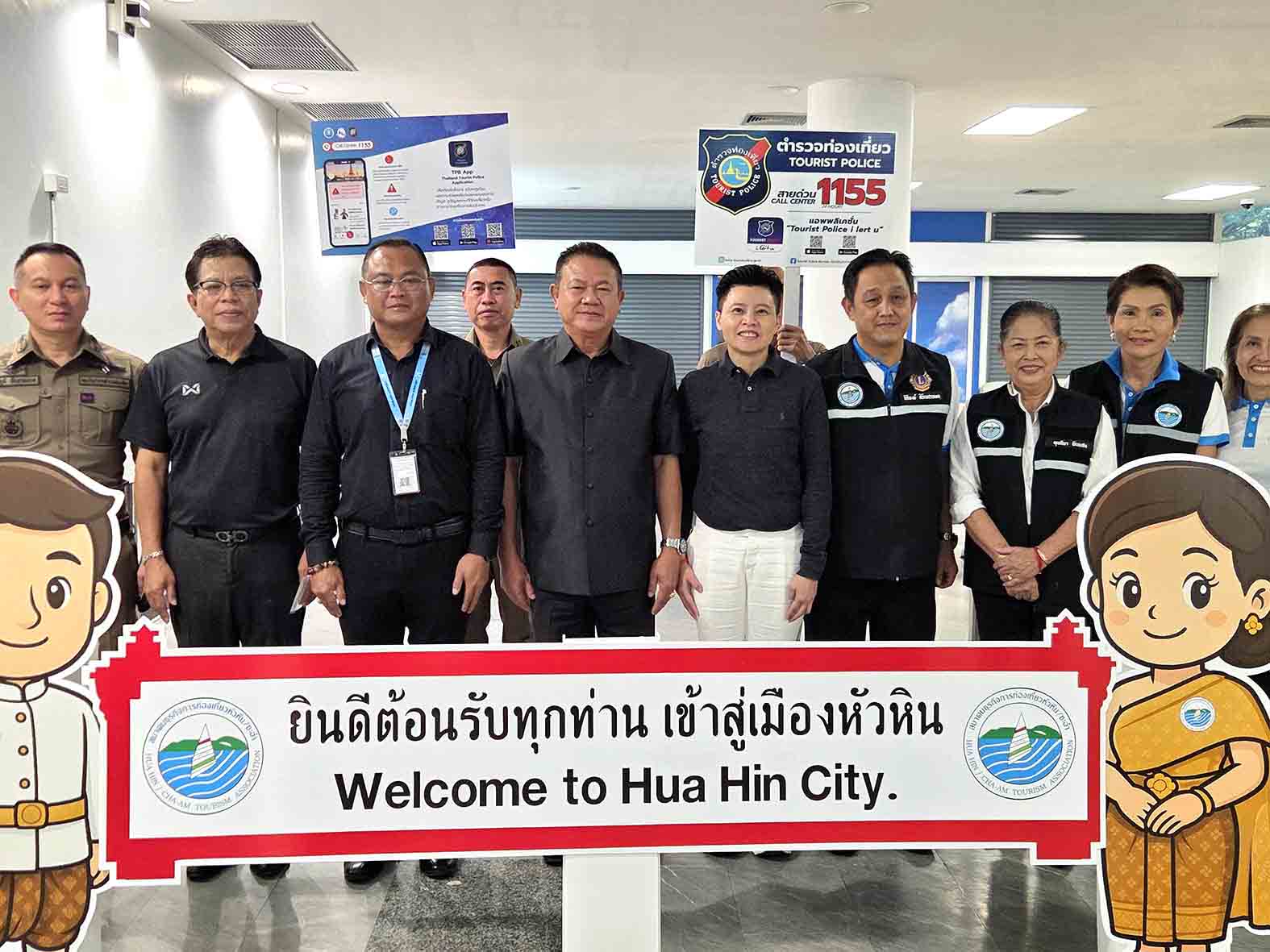 เมื่อเวลา 16.30 น. วันที่ 5 พฤศจิกายน 2568 นายอติชาติ ชัยศรี รองนายกเทศมนตรีนครหัวหิน น.ส.วรกานต์ ถาวร รองผู้อำนวยการ การท่องเที่ยวแห่งประเทศไทย (ททท.) สำนักงานประจวบฯ นายสมชาย กระแจะเจิม ประธานสภาอุตสาหกรรมท่องเที่ยวจังหวัดประจวบฯ นายกิติพงษ์ สิริเพชรเกษม นายกสมาคมธุรกิจท่องเที่ยวหัวหิน/ชะอำ พ.ต.อ.ยุทธภูมิ ปั้นลายนาค รอง ผบก.ทท.3 พ.ต.ท.อาณัฐชัย ก้อนทอง สวญ.ส.ทท.2 กก.1 บก.ทท.3 นายรัฐพล เจริญสุข ผู้อำนวยการท่าอากาศยานหัวหิน หน่วยงานและโรงแรมต่างๆ ร่วมให้การต้อนรับคณะนักท่องเที่ยวทั้งชาวไทยและต่างชาติจำนวน 165 คน ที่โดยสารมากับสายการบินแอร์เอเชีย เที่ยวบินที่ FD 3900 จากเชียงใหม่ เพื่อมาเที่ยวหัวหินในช่วงเทศกาลลอยกระทง ที่ท่าอากาศยานหัวหิน จ.ประจวบฯ พร้อมกันนี้ได้แจกโบว์ริบบิ้นสีดำให้นักท่องเที่ยว เพื่อร่วมถวายความอาลัยแด่สมเด็จพระนางเจ้าสิริกิติ์ พระบรมราชินีนาถ พระบรมราชชนนีพันปีหลวง และมอบของที่ระลึกจาก ททท. จากสมาคมฯ เป็นกระติกน้ำ ผ้าเช็ดหน้าลายช้าง พวงกุญแจ และแม่เหล็กติดตู้เย็นรูปสถานที่ท่องเที่ยวของหัวหิน ให้กับนักท่องเที่ยวท่ามกลางบรรยากาศต้อนรับอย่างอบอุ่น