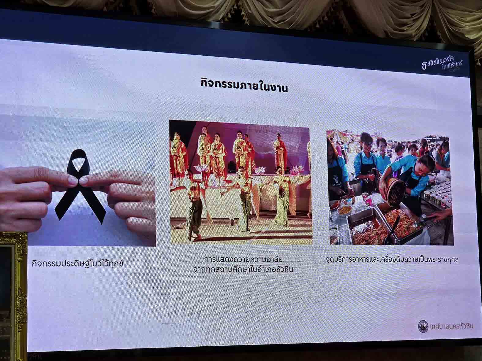 นายนพพร วุฒิกุล กล่าวว่า ตามที่ สำนักนายกรัฐมนตรีได้มีประกาศ เรื่อง สมเด็จพระนางเจ้าสิริกิติ์ พระบรมราชินีนาถ พระบรมราชชนนีพันปีหลวง เสด็จสวรรคต เมื่อวันที่ 24 ตุลาคม 2568 โดยให้สถานที่ราชการ รัฐวิสาหกิจ หน่วยงานของรัฐและสถานศึกษาทุกแห่ง ร่วมจัดกิจกรรมเพื่อแสดงความอาลัยแด่สมเด็จพระนางเจ้าสิริกิติ์ พระบรมราชินีนาถ พระบรมราชชนนีพันปีหลวง ในส่วนของอำเภอหัวหิน จึงได้กำหนดจัดกิจกรรมแสดงความไว้อาลัยฯ ในวันที่ 1 ธันวาคมนี้ ตั้งแต่เวลา 15.00 – 19.00 น. ที่อุทยานราชภักดิ์ หัวหิน โดยมีการแสดงโขน ตอนพิเศษ “รามราชจักรี ปราบไพรี น้อมถวายพระพันปีหลวง” กิจกรรมแปรรูปอักษรจากนักเรียนโรงเรียนนายสิบทหารบก จำนวน 1,200 นาย กิจกรรมจุดเทียนถวายความอาลัย กิจกรรมทำโบว์ริบบิ้นสีดำเครื่องหมายแสดงความอาลัยจำนวน 9,300 ชิ้น เพื่อมอบให้แก่ประชาชน พร้อมกันนี้มีจัดตั้งโรงทานจิตอาสาเพื่อถวายเป็นพระราชกุศล เตรียมอาหาร ผลไม้ เครื่องดื่มและของว่างต่างๆ ไว้สำหรับบริการประชาชนประมาณ 4,000 – 5,000 คน ที่มาร่วมงาน ซึ่งหากหน่วยงานใดที่ประสงค์จะออกโรงทานร่วม ก็ให้มาลงชื่อได้ที่สำนักงานเทศบาลนครหัวหิน ตั้งแต่วันนี้จนถึงวันที่ 13 พฤศจิกายน พร้อมกันนี้ขอเชิญชวนประชาชนทุกท่านร่วมงานดังกล่าว เพื่อเป็นการแสดงความไว้อาลัยและรำลึกในพระมหากรุณาธิคุณอันหาที่สุดมิได้ของพระองค์ท่าน.