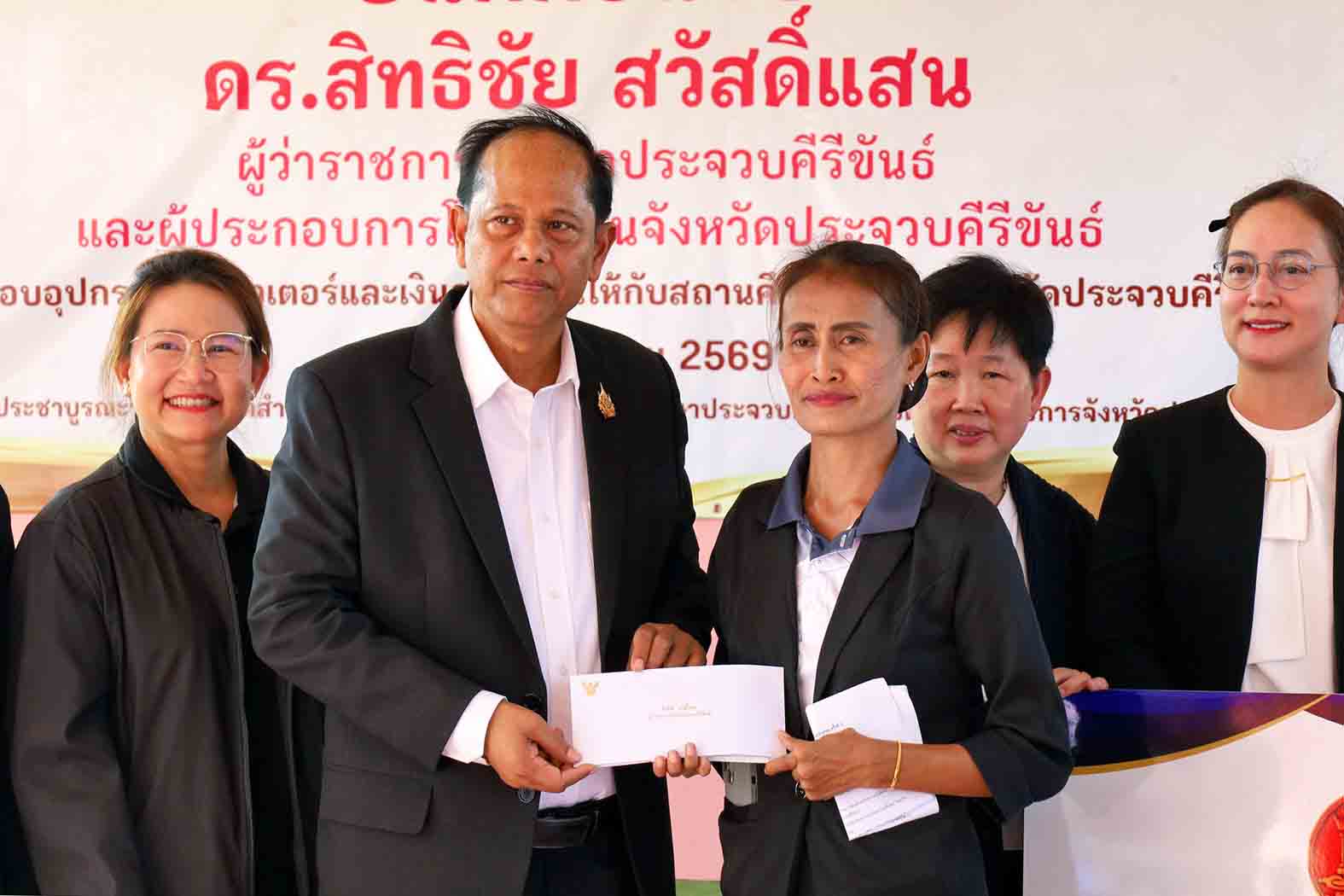 วันที่ 29 มกราคม 2569 นายสิทธิชัย สวัสดิ์แสน ผู้ว่าราชการจังหวัดประจวบฯ เป็นประธานส่งมอบอุปกรณ์คอมพิวเตอร์และเงินสนับสนุนให้แก่สถานศึกษาในพื้นที่จังหวัดประจวบฯ ครั้งที่ 3 ที่โรงเรียนประชาบูรณะวิทยา ต.อ่าวน้อย อ.เมืองประจวบฯ โดยมีผู้ช่วยศาสตราจารย์ ว่าที่ร้อยตรี ดร.กิตติคุณ รุ่งเรือง คณบดีคณะศึกษาศาสตร์ มหาวิทยาลัยศรีนครินทรวิโรฒ น.ส.ชุติกาญจน์ จันทร์สุริยา รองศึกษาธิการจังหวัด น.ส.วรลักษณ์ จันทร์ผา ผู้อำนวยการสำนักงานเขตพื้นที่การศึกษาประถมศึกษาจังหวัดฯ เขต 1 น.ส.ไพสน สำราญรมย์ ผู้อำนวยการโรงเรียนประชาบูรณะวิทยา หัวหน้าส่วนราชการ ประธานหอการค้าจังหวัด นายอำเภอเมืองประจวบฯ ผู้ประกอบธุรกิจโรงแรม คณะครูและนักเรียนโรงเรียนประชาบูรณะวิทยาและโรงเรียนฮาฟิซประจวบฯ เข้าร่วมพิธี