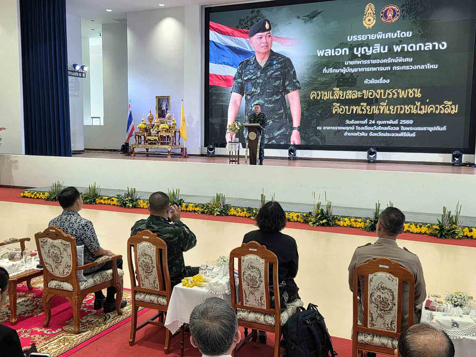 วันที่ 24 กุมภาพันธ์ 2569 ที่อาคารราชพฤกษ์ โรงเรียนวังไกลกังวล ในพระบรมราชูปถัมภ์ อ.หัวหิน จ.ประจวบฯ ได้จัดบรรยายพิเศษหัวข้อ “ความเสียสละจากบรรพชน คือบทเรียนที่เยาวชนไม่ควรลืม” โดยพลเอกบุญสิน พาดกลาง หรือ “แม่ทัพกุ้ง” นายทหารราชองครักษ์พิเศษ อดีตแม่ทัพภาคที่ 2 ที่ปรึกษาผู้บัญชาการทหารบก กระทรวงกลาโหม เป็นวิทยากรถ่ายทอดประสบการณ์ตรงในการอุทิศตนรับใช้ชาติ พร้อมปลูกฝังอุดมการณ์ความเสียสละและจิตสำนึกรักชาติให้กับเยาวชน โดยมีพลตรี อรรถชัย รักษาศิลป์ อดีตผู้บัญชาการมณฑลทหารบกที่ 21 และผู้อำนวยการศูนย์อำนวยการจิตอาสาพระราชทาน มณฑลทหารบกที่ 21 นายศุภชัย ครุฑดำ นายอำเภอหัวหิน พ.ต.อ.เสมอ อยู่สำราญ ที่ปรึกษานายกเทศมนตรีนครหัวหิน นางราตรี ศรีไพรวรรณ ผู้อำนวยการโรงเรียนวังไกลกังวล ในพระบรมราชูปถัมภ์ แขกผู้มีเกียรติ หัวหน้าส่วนราชการ คณะครู นักเรียน และศิษย์เก่ากว่าหนึ่งพันคนให้การต้อนรับและชมการแสดงจินตลีลาประกอบการบรรเลงเพลงซึ่งบรรยากาศภายในงานเป็นไปอย่างอบอุ่นและเปี่ยมด้วยความซาบซึ้ง