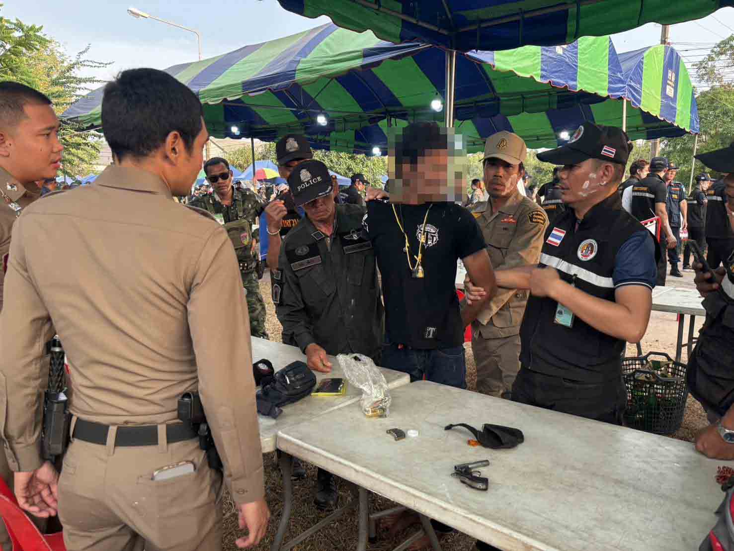 ระหว่างการตรวจค้นอย่างเข้มงวด เจ้าหน้าที่ชุดปฏิบัติสังเกตเห็นชายต้องสงสัย อายุประมาณ 30 ปี มีท่าทีลุกลี้ลุกลนพยายามเลี่ยงจุดตรวจ ทันทีที่เจ้าหน้าที่ขอตรวจค้นกระเป๋าสะพายใบเล็ก พบอาวุธปืนพกสั้น ขนาด .38 พร้อมกระสุนเต็มอัตรา 6 นัด โดยมี 1 นัดถูกใส่ไว้ในรังเพลิงแล้ว ผู้ต้องหาตัดสินใจสะบัดตัว วิ่งหลบหนีฝ่าความมืดออกไปทางด้านหลังรีสอร์ทใกล้เคียง เจ้าหน้าที่ต้องวิ่งไล่กวดจนสามารถตะครุบตัวเอาไว้ได้