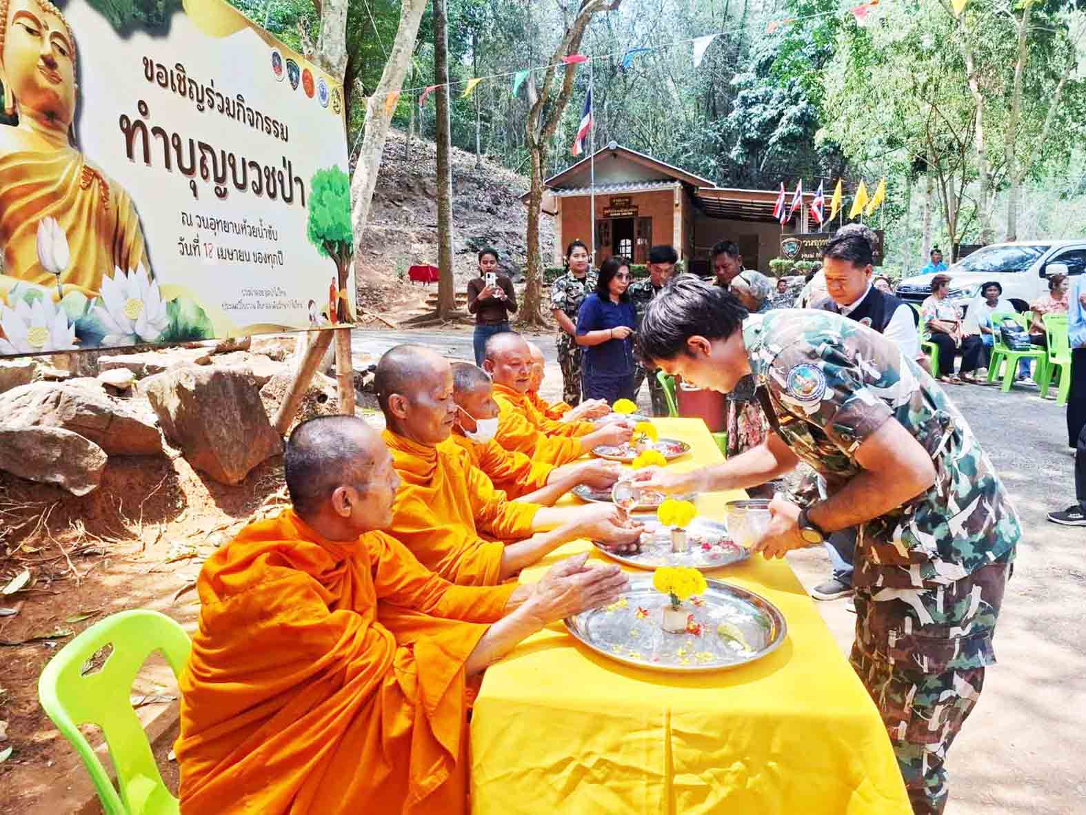 วันที่ 19 เมษายน 2569 นายนิทัศน์ นุ่นสง ผู้อำนวยการสำนักบริหารพื้นที่อนุรักษ์ที่ 3 (สบอ.3) สาขาเพชรบุรี เปิดเผยว่า วนอุทยานห้วยน้ำซับ โดยนายรณกร รังกา หัวหน้าวนอุทยานห้วยน้ำซับและเจ้าหน้าที่ ได้ผนึกกำลังร่วมกับชุมชนบ้านสายเพชร ต.ทองมงคล อ.บางสะพาน จ.ประจวบฯ พร้อมด้วยภาคีเครือข่าย ทั้งอุทยานแห่งชาติอ่าวสยาม ฝ่ายปกครองอำเภอบางสะพาน อบต.ทองมงคล นักเรียนนักศึกษา กำนันและผู้ใหญ่บ้านในพื้นที่ ร่วมกันจัดกิจกรรมทำบุญบวชป่า เพื่อสร้างขวัญและกำลังใจให้กับคนในชุมชน ภายในงานมีการผสานประเพณีอันงดงามหลังเทศกาลสงกรานต์ ทั้งการสรงน้ำพระและรดน้ำดำหัวผู้ใหญ่ เพื่อขอขมาและรับศีลรับพร เป็นการแสดงพลังความสามัคคีที่มุ่งเน้นการดูแลรักษาป่าไม้ไปพร้อมกับการสืบสานวัฒนธรรมไทย