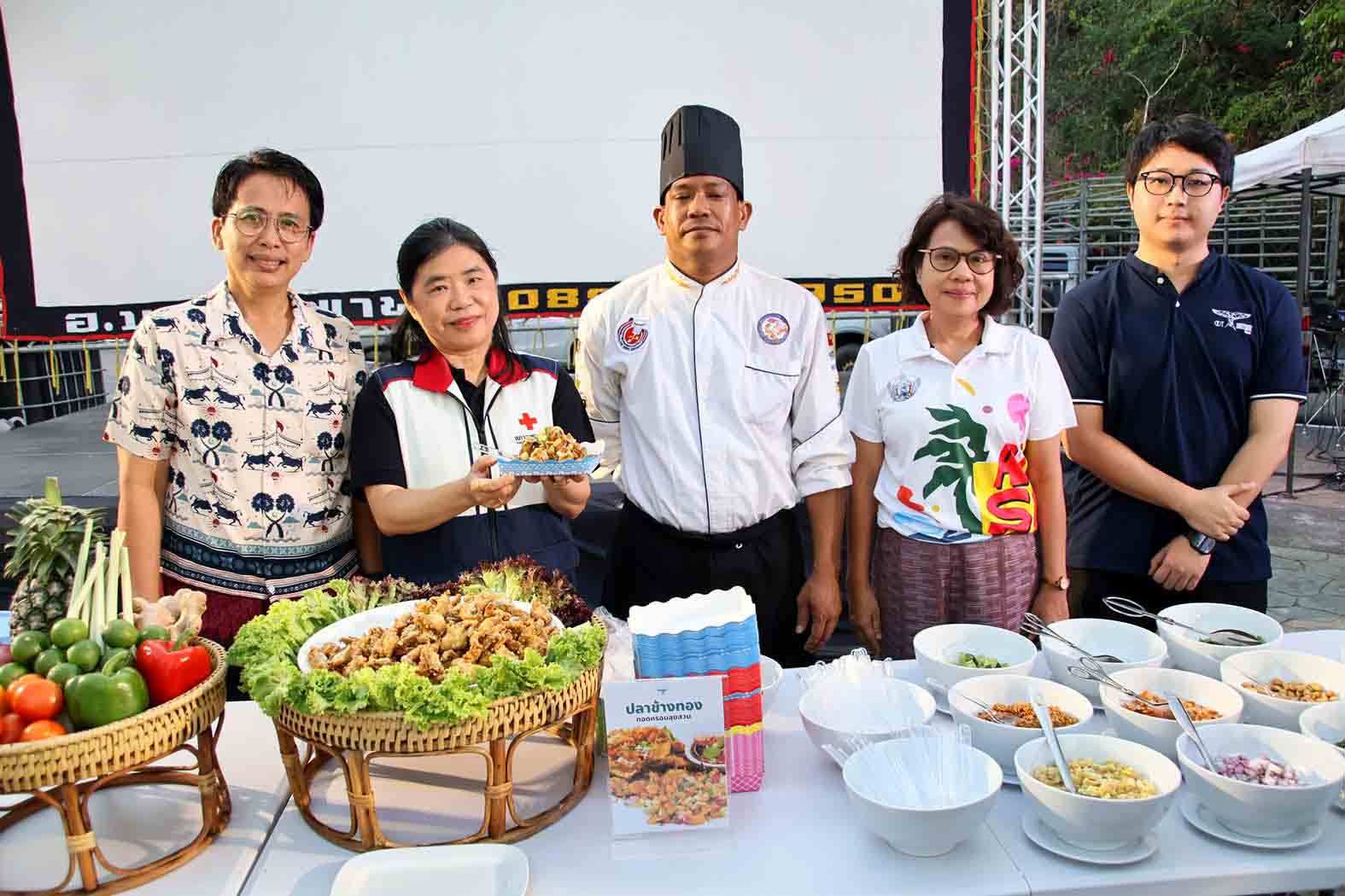 บรรยากาศภายในงานท่องเที่ยวประจวบคีรีขันธ์ มหัศจรรย์เมืองสามอ่าว และงานกาชาด ประจำปี 2569 เมื่อช่วงค่ำวันที่ 26 เมษายน 2569 เป็นไปอย่างคึกคัก โดยเฉพาะบริเวณโซน “ลานพุงกาง ดูกลางแปลง” ที่กลายเป็นจุดสนใจของนักท่องเที่ยว เมื่อโรงแรมชื่อดังอย่าง แอทที บูทีค คลองวาฬ นำโดย นายชินสุวัตร มานะกิจสมบูรณ์ เจ้าของโรงแรม พร้อมทีมเชฟมือโปร ร่วมจัดกิจกรรมสาธิตการทำอาหารเมนูขึ้นชื่อของโรงแรมเพื่อสร้างสีสันให้กับงาน ไฮไลต์สำคัญอยู่ที่การรังสรรค์เมนู “ปลาข้างทองทอดกรอบลุยสวน” ซึ่งทีมเชฟได้โชว์ทักษะตั้งแต่ขั้นตอนการหมักเนื้อปลาข้างทอง วัตถุดิบขึ้นชื่อของท้องถิ่น นำไปทอดจนเหลืองทองกรอบ น่ารับประทาน ก่อนจะนำมาคลุกเคล้ากับเครื่องสมุนไพรครบเครื่อง ทั้งใบชะพลู พริกขี้หนู ถั่วลิสงคั่ว กุ้งแห้ง หอมแดง มะนาว มะพร้าวคั่ว และขิง เพิ่มความกลมกล่อมด้วยน้ำซอสสูตรลับเฉพาะ จนได้รสชาติที่จัดจ้านและลงตัว